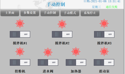 控制箱置于支架上,箱上各運(yùn)轉(zhuǎn)設(shè)備及加熱件均設(shè)有自動(dòng)手動(dòng)檔,當(dāng)打至手動(dòng)時(shí),相應(yīng)部分可由人工控制;打至自動(dòng)時(shí),則進(jìn)入自動(dòng)運(yùn)行。若某設(shè)備出現(xiàn)故障時(shí),則會報(bào)警,提醒用戶進(jìn)行處理或檢修。