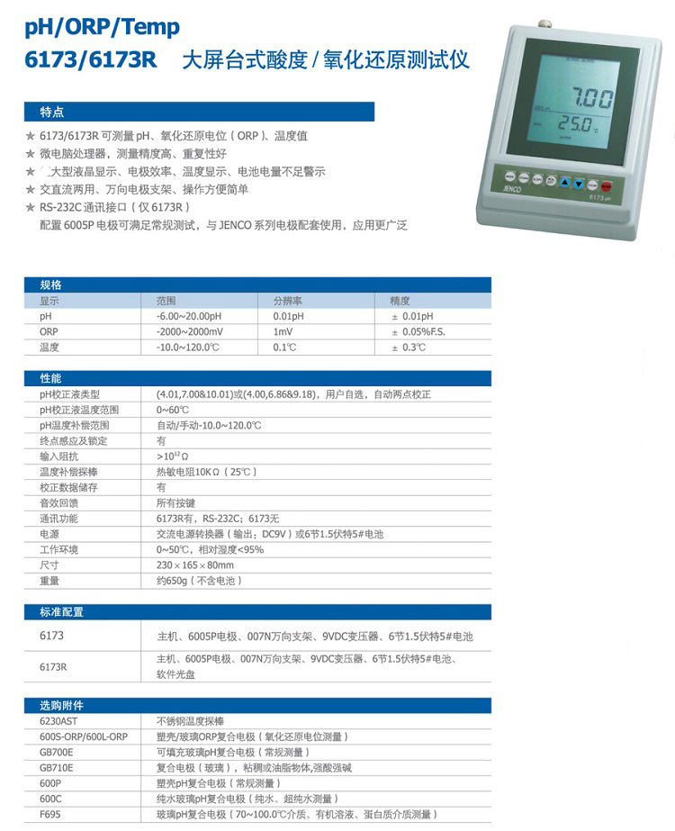 JENCO/任氏6173R臺(tái)式電腦型PH/ORP計(jì) 便攜酸堿度計(jì)/mV/溫度計(jì)儀