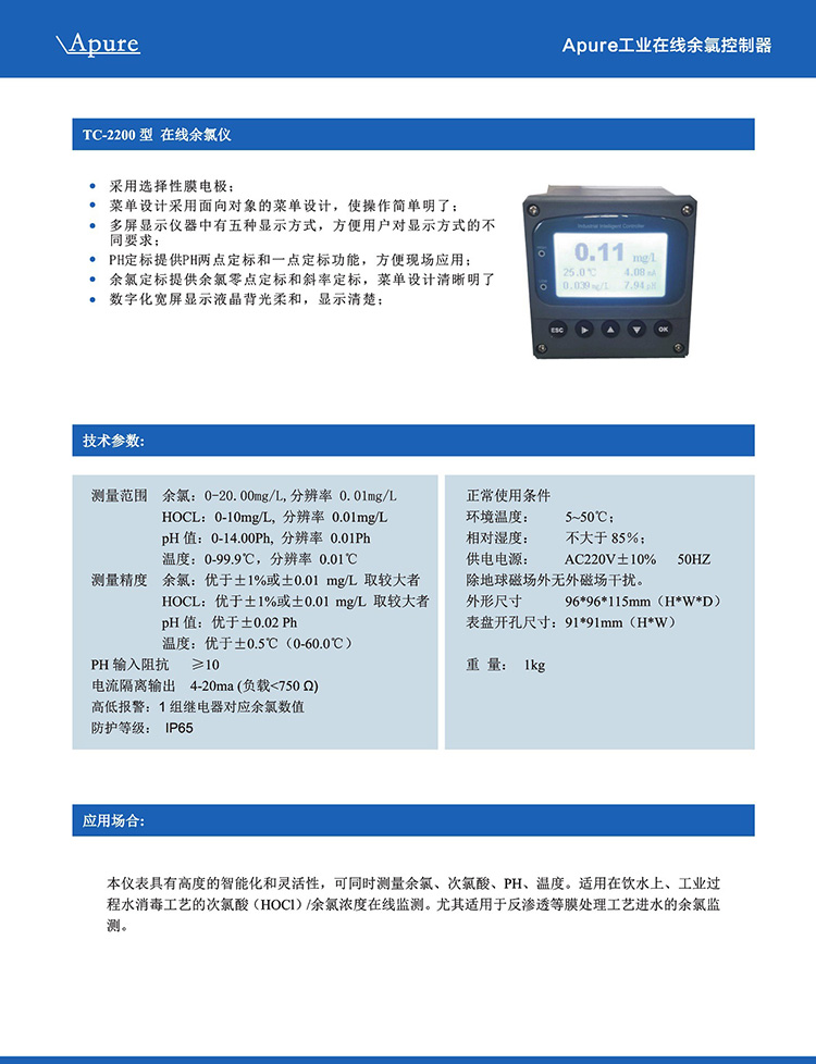 Apure愛(ài)普爾余氯儀TC-2200工程在線極譜式余氯溫度PH測(cè)量控制器