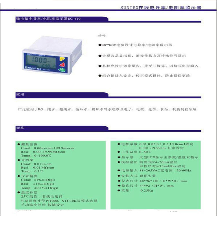SUNTEX電導(dǎo)率儀EC-410水質(zhì)監(jiān)測電導(dǎo)率控制儀電阻率變送器