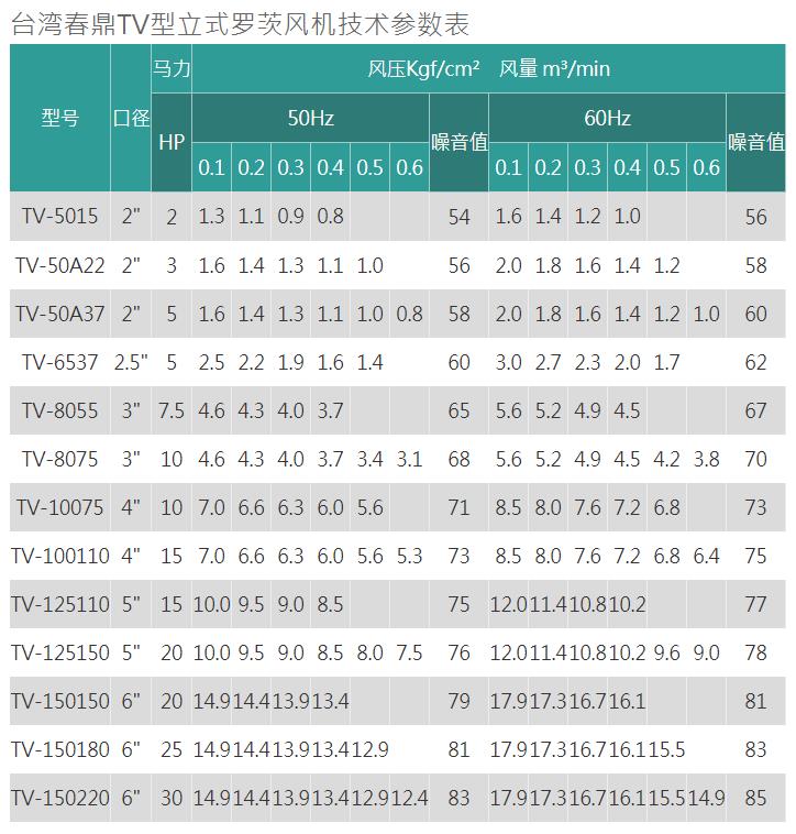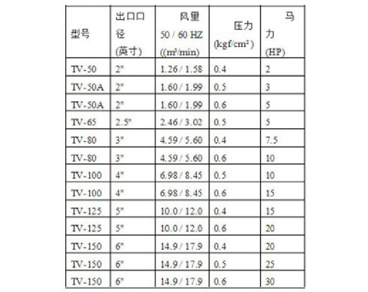 六.春鼎TV型直立式羅茨風(fēng)機產(chǎn)品規(guī)格: 壓送用途適用壓力∶0 ~ 0.6 kgf/cm2 2 ~ 30HP另外可依特殊材質(zhì)指定設(shè)計TV型直立式羅茨鼓風(fēng)機產(chǎn)品特性較低的能源損耗∶春鼎TV型直立式羅茨鼓風(fēng)機的設(shè)計能減少逆流對轉(zhuǎn)子的壓力, 相對也能減少對能源的損耗。較低的噪音∶壓力脈沖是主要的噪音源,春鼎直立式羅茨鼓風(fēng)機相較于皮帶式羅茨鼓風(fēng)機能有效降低噪音達(dá)五分貝。減免經(jīng)常性之保養(yǎng)困擾∶春鼎直立式羅茨鼓風(fēng)機采用直結(jié)式傳動,可減免皮帶之經(jīng)常性損耗保養(yǎng)及機氣漏油之困擾。機器體積小,不占空間∶春鼎直立式羅茨鼓風(fēng)機體積小,不占空間,而出氣口可依現(xiàn)場環(huán)境調(diào)整方向,安裝容易。裝置簡單∶裝置簡單、省工時、不占空間、不需隔音設(shè)備┅┅即達(dá)成低噪音之生活空間