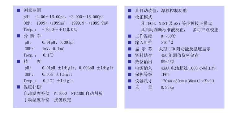 防水、外觀輕巧、攜帶方便,具自動(dòng)溫度補(bǔ)償功能;大型LCD屏幕,方便讀取測(cè)值。具備多種自動(dòng)校正功能與低耗電特性,適合野外量測(cè)或現(xiàn)場(chǎng)制程及廢水處理等量測(cè)。