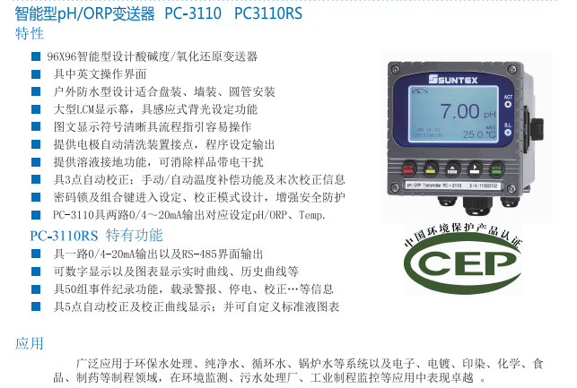 SUNTEX (中國環(huán)境保護(hù)認(rèn)證)智能型pH/ORP變送器PC-3110  PC3110RS